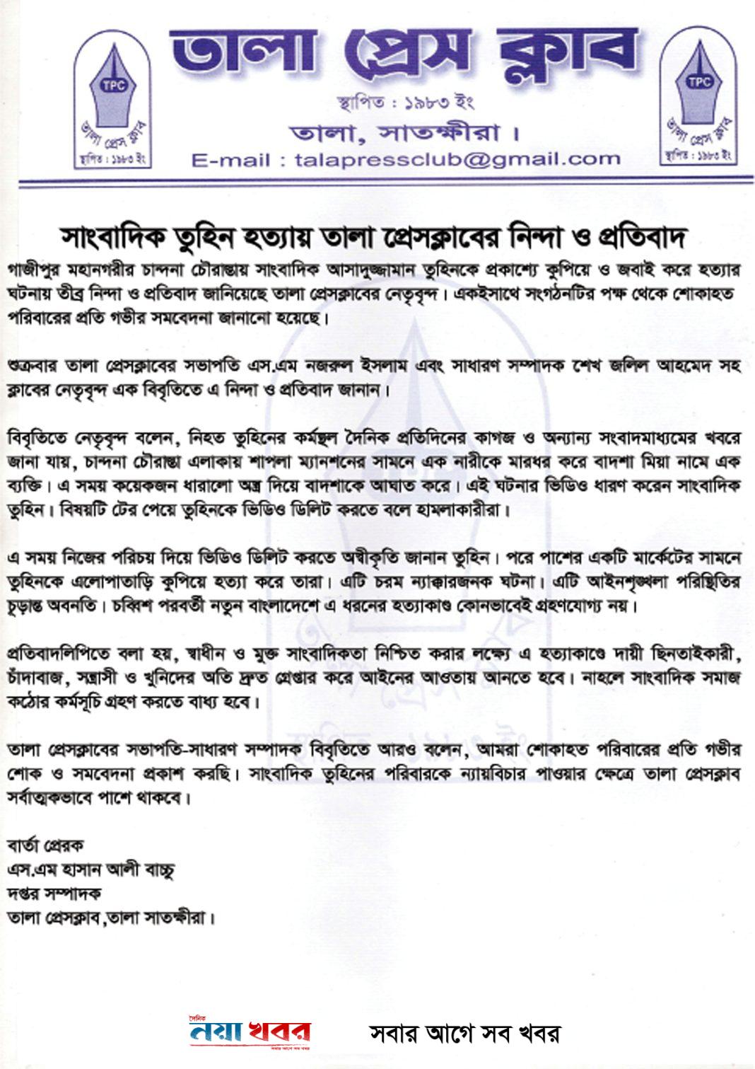 গাজীপুর মহানগরীর চান্দনা চৌরাস্তায় সাংবাদিক আসাদুজ্জামান তুহিনকে প্রকাশ্যে কুপিয়ে ও জবাই করে হত্যার ঘটনায় তীব্র নিন্দা ও প্রতিবাদ জানিয়েছে তালা প্রেসক্লাবের নেতৃবৃন্দ। একইসাথে সংগঠনটির পক্ষ থেকে শোকাহত পরিবারের প্রতি গভীর সমবেদনা জানানো হয়েছে।
