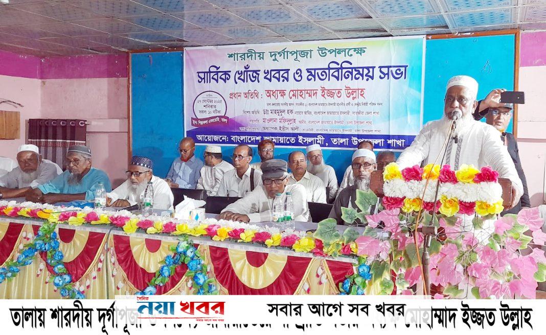 তালায় দূর্গা পূজার সার্বিক খোজখবর ও হিন্দু সম্প্রদায়ের সাথে জামায়াতে ইসলামীর মতবিনিময় সভা অনুষ্ঠিত হয়েছে। শনিবার(২৭ শে) সেপ্টেম্বার সকালে তালা উপজেলা শিল্পকলা একাডেমী হলরুমে উপজেলা জামায়াতে ইসলামীর আমীর মাওলানা মফিদুল্লাহর সভাপতিত্বে প্রধান অতিথি হিসাবে বক্তব্য রাখেন সাতক্ষীরা -১ (তালা-কলারোয়া ) আসনের সংসদ সদস্য পদপ্রাথী ও জামায়াতের কেন্দ্রীয় কর্ম পরিষদ সদস্য অধ্যক্ষ ইজ্জত উল্লাহ।