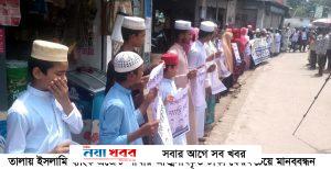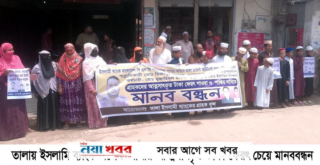 মঙ্গলবার (০৩ ই এপ্রিল) সকাল ১১ টায় তালা বাজার সংলগ্ন খেয়াঘাট রোডস্থ ইসলামি ব্যাংক তালা শাখা অফিসের সামনে ভুক্তভোগী গ্রাহকদের আয়োজনে মানববন্ধনটি অনুষ্ঠিত হয়। মানববন্ধনে বক্তব্য রাখেন গ্রাহক আলহাজ্ব মীর আব্দুল কাসিম,মোঃ বাবলুর রহমান,মোঃ সুলতান,নজরুল ইসলাম, শিক্ষক মহিউদ্দিন, জাহানারা বেগম,রোজিনা খাতুন মমতাজ বেগম প্রমূখ।
