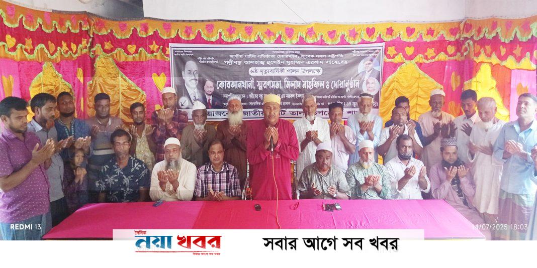 সোমবার(১৪ ই জুলাই)বিকালে তালা উপজেলা জাতীয় পার্টির আয়োজনে কোরআন তেলোওয়াত, স্মরণ সভা,মিলাদ মাহফিল,দোয়ানুষ্ঠান অনুষ্ঠিত হয়েছে।